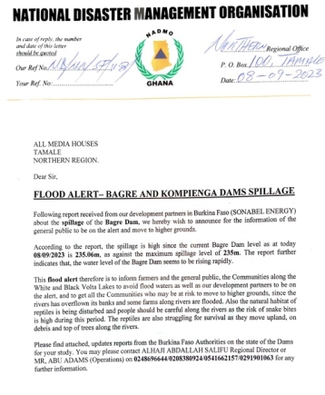 The National Disaster Management Organization (NADMO) has issued a flood alert following reports of a spillage at the Bagre Dam, based on information received from Burkina Faso’s power utility company, SONABEL ENERGY.