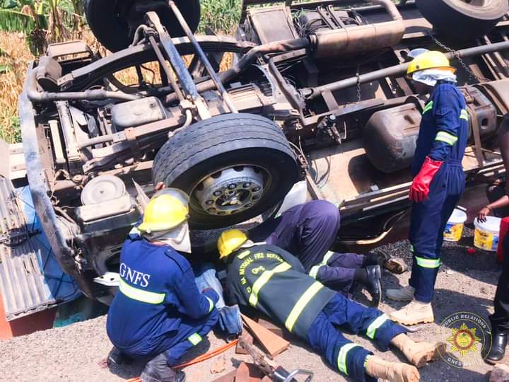 “Firefighters from the Akropong Municipal Fire Station rescued two casualties from a fatal accident at Asssenema in the Okere District of the Eastern Region.