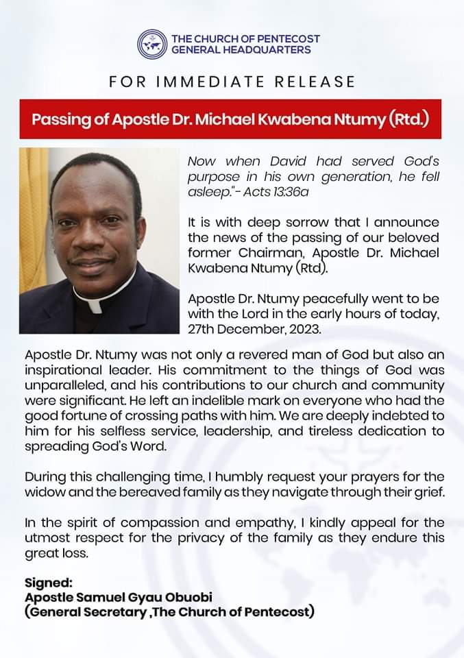 “It is with deep sorrow that I announce the news of the passing of our beloved former Chairman, Apostle Dr. Michael Kwabena Ntumy (Rtd).”