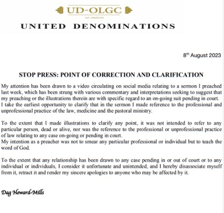 In his statement, Heward-Mills asserted, “My intention as a preacher was not to smear any particular professional or individual but to teach the word of God. To the extent that any relationship has been drawn to any case pending in or out of court or to any individual or individuals, I consider it unfortunate and unintended, and I hereby disassociate myself from it, retract it and render my sincere apologies to anyone who may be affected by it.”