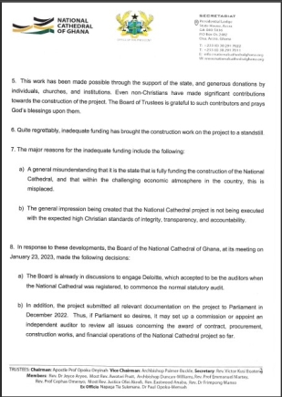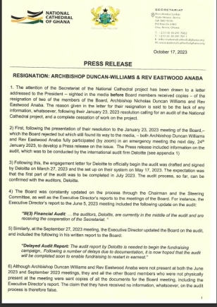 In a joint resignation letter, they cited failure on the part of the Board of the National Cathedral to appoint an independent accounting firm to audit their finances in order to ensure transparency and accountability to the people of Ghana.
