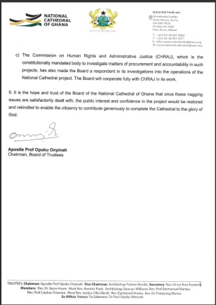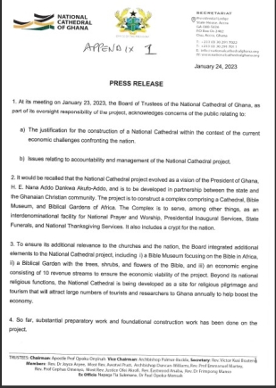 But, reacting to the reasons for which Archbishop Duncan-Williams and Rev. Eastwood Anaba resigned from the Cathedral’s Board in a press statement dated October 18, 2023, the Executive Director of the National Cathedral Project said even though the two clergymen had missed some meetings of the Board of Trustees, they were duly briefed on the said meetings through minutes taken at the said meetings.