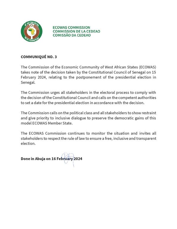 The ECOWAS Commission in a statement dated February 16, 2024, said the Commission takes note of the decision by the Constitutional Council of Senegal on 15 February 2024, relating to the postponement of the presidential election in Senegal.