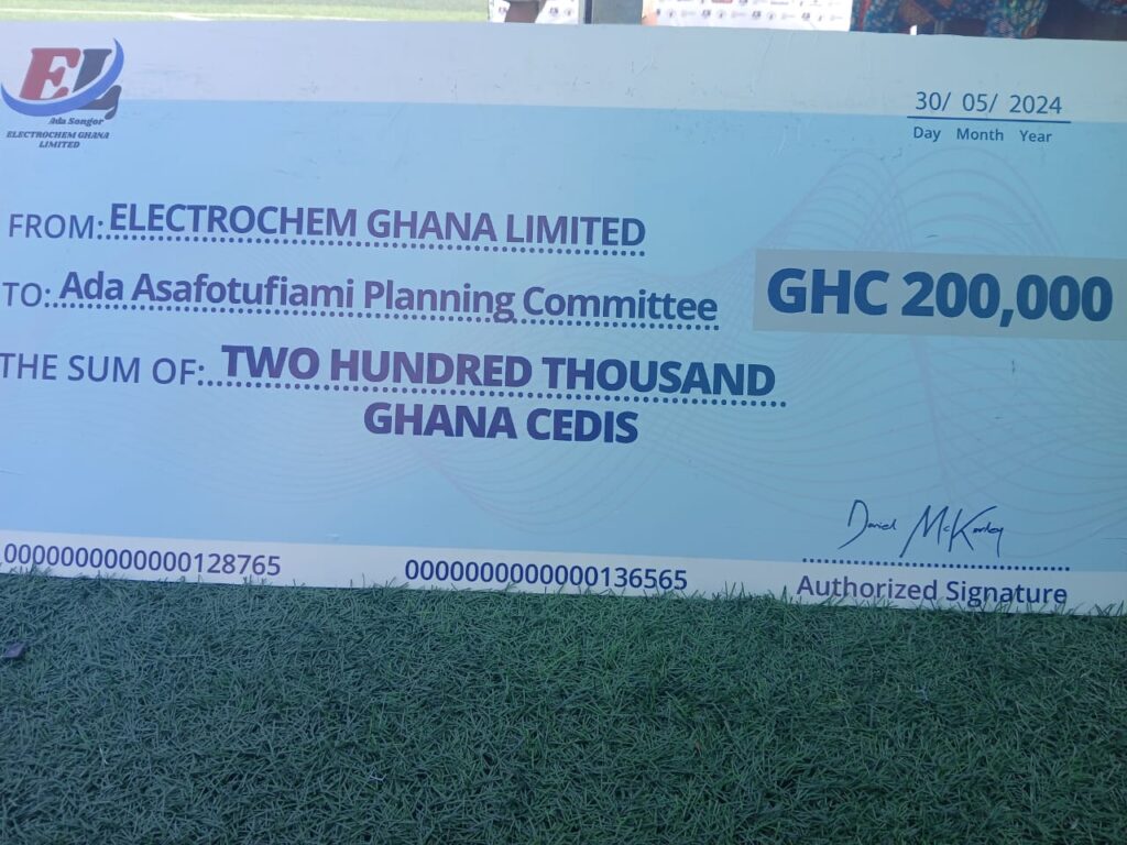Electrochem Ghana Limited, a subsidiary of the McDan Group, operators of Africa’s largest salt mine and processing plant in Ada Songor for commercial salt production for domestic use and export has donated Two Hundred Thousand Ghana cedis (GHC 200,000) to the Ada Traditional Council in support of this year’s Asafotufiami.