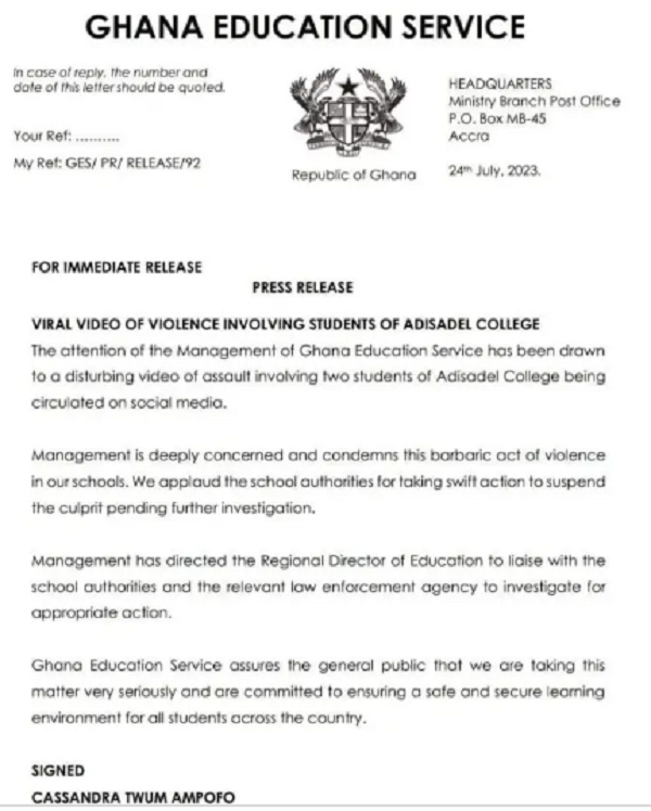The Ghana Education Service (GES) has directed the immediate suspension of the student at the centre of a viral video emanating from Adisadel College in the Central Region where a student was seen assaulting another.