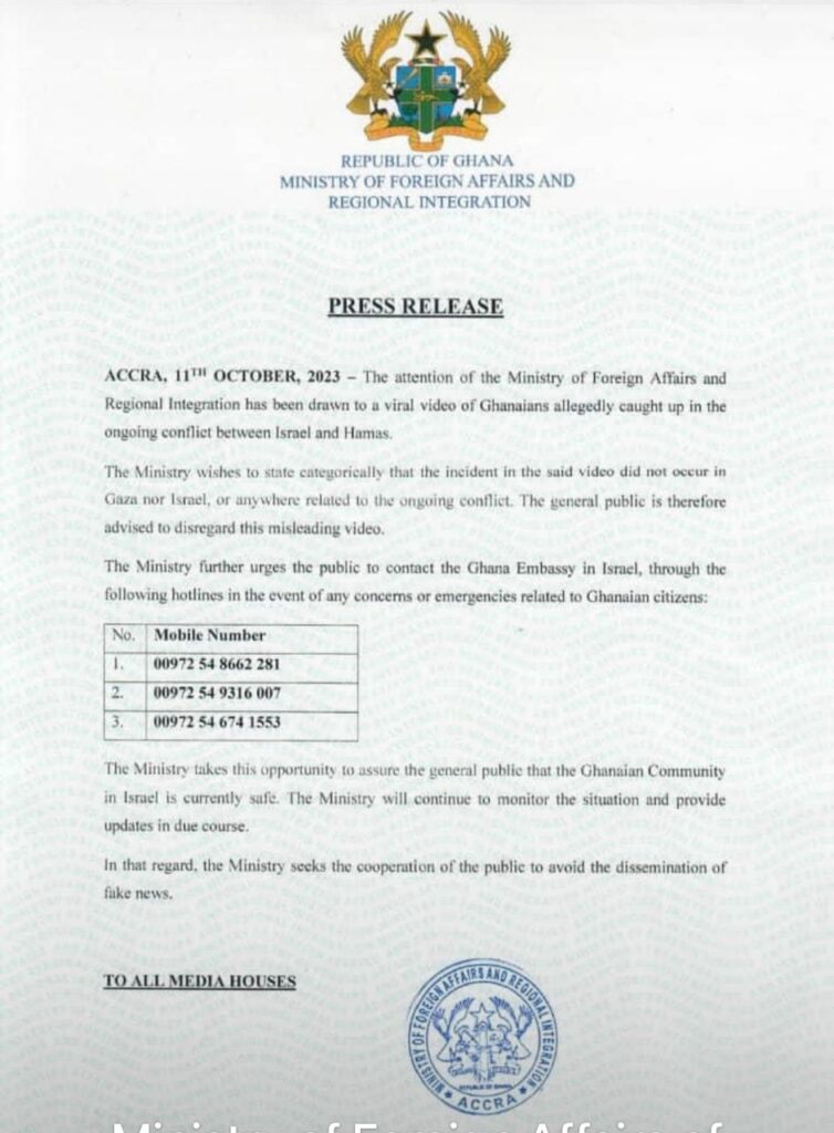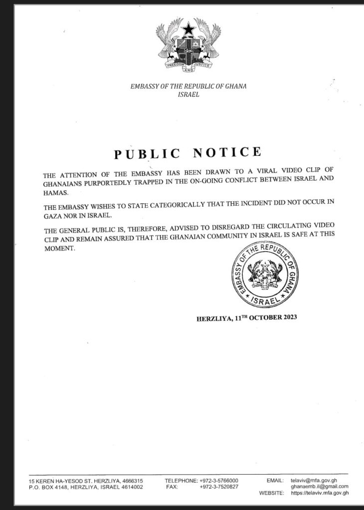 It therefore advised the public to disregard the circulating video clip and remain assured that the Ghanaian community in Israel is safe at this moment.