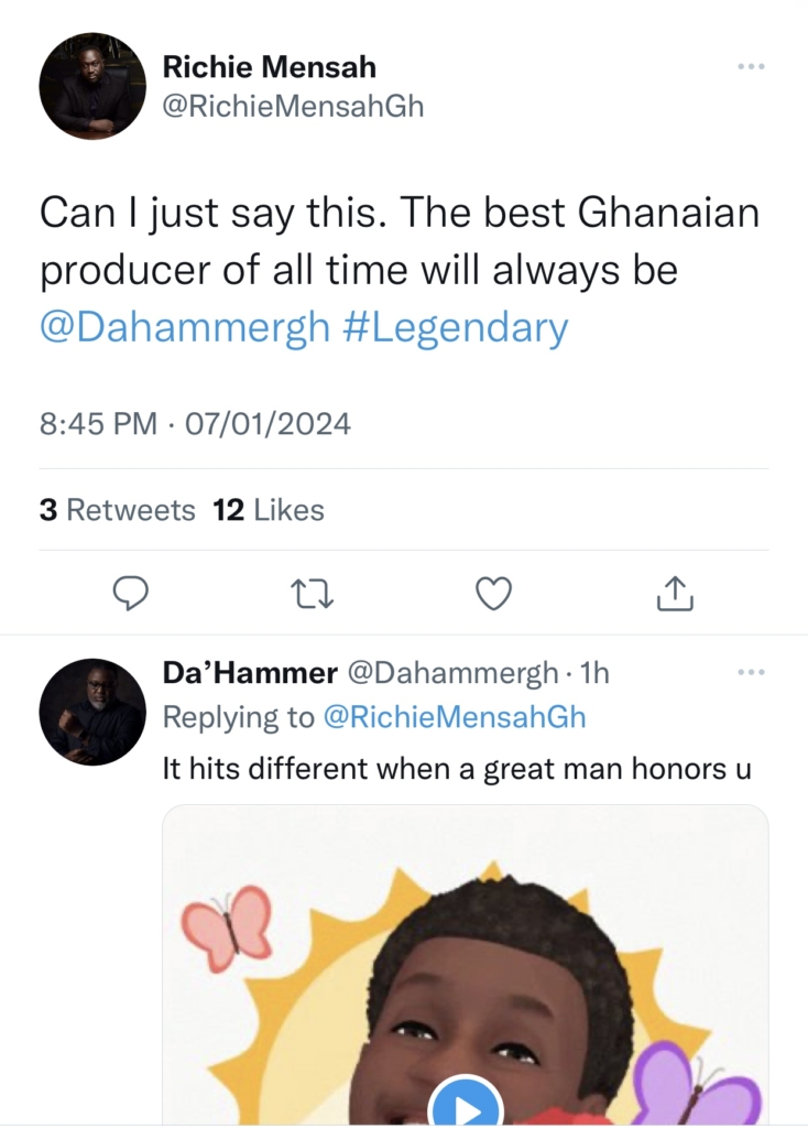 In a post on X, Richie wrote: “Can I just say this? The best Ghanaian producer of all time will always be Hammer.”