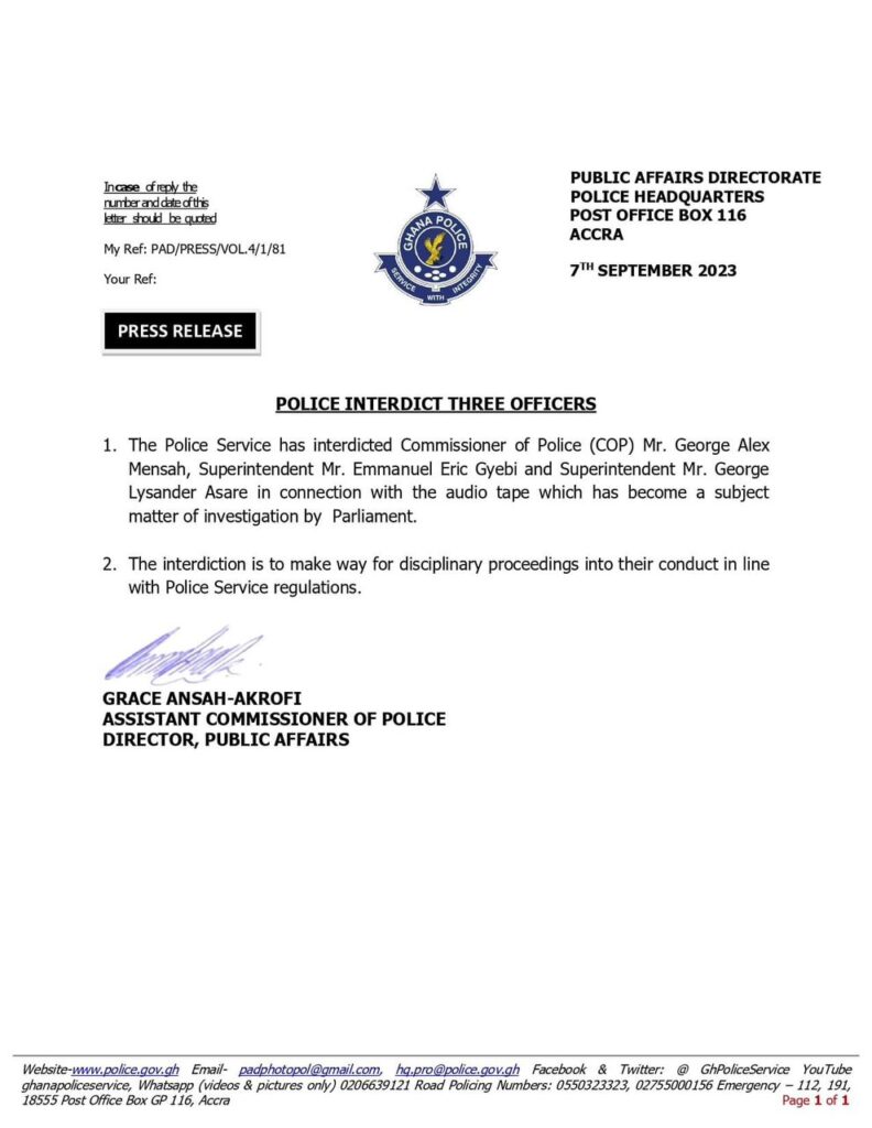 “The Police Service has interdicted Commissioner Mr George Alex Mensah, Superintendent Mr Emmanuel Eric Gyebi and Superintendent Mr George Lysander Asare in connection with the audio tape which has become a subject matter of investigation by Parliament.”