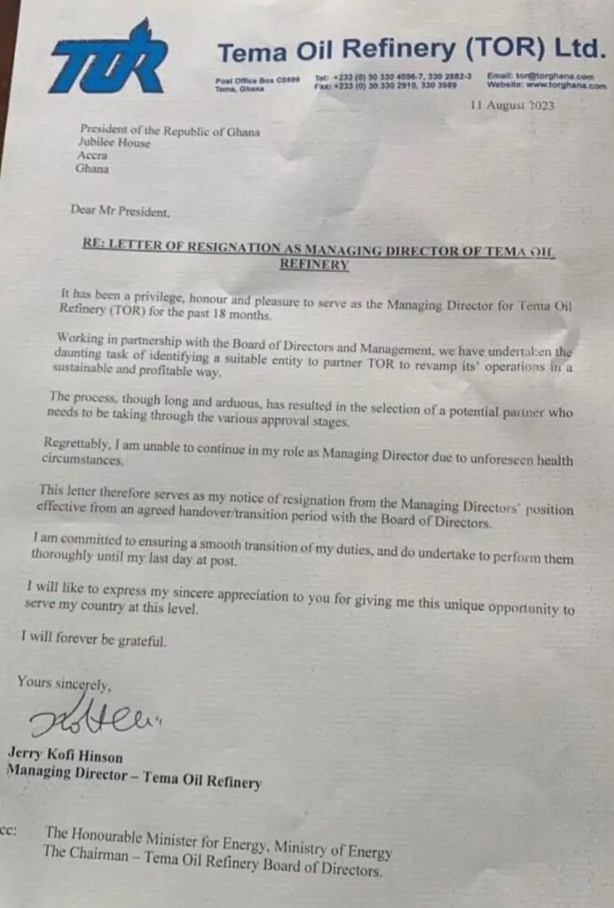 The Managing Director of the Tema Oil Refinery (TOR), Jerry Kofi Hinson has resigned from office.