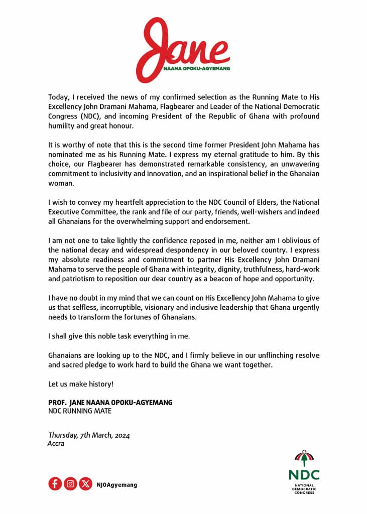 She remarked, “Today, I received the news of my confirmed selection as the Running Mate to His Excellency John Dramani Mahama, Flagbearer and Leader of the National Democratic Congress (NOC), and incoming President of the Republic of Ghana with profound humility and great honour.