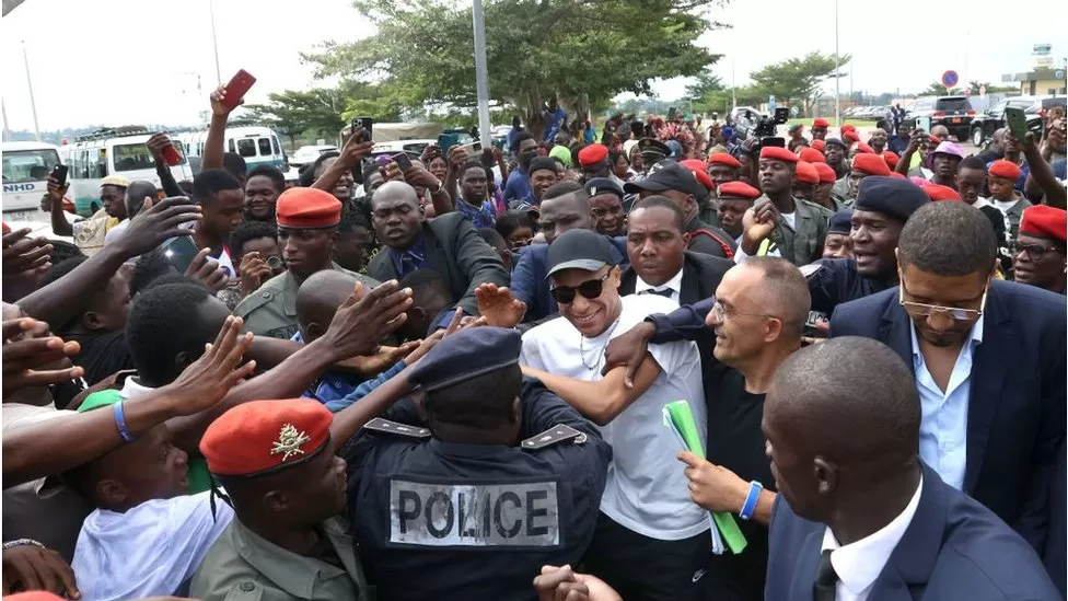 The football star was surrounded by hundreds of eager fans as he arrived in Cameroon on Thursday