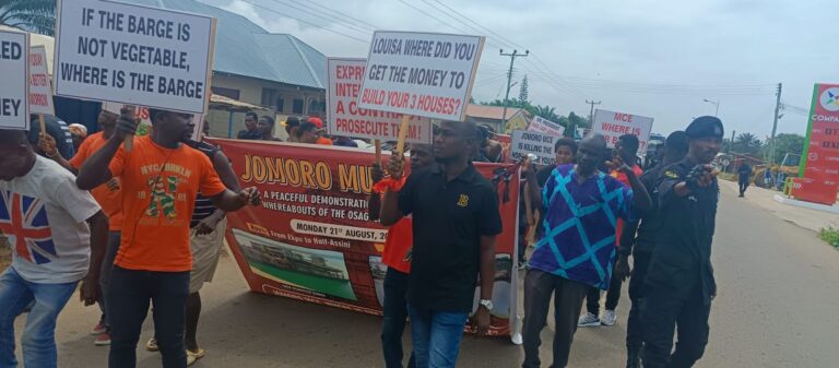 Residents of Jomoro (Nzemaland), mostly the youth, have staged a peaceful protest by demanding the whereabouts of the Osagyefo Power Barge.
