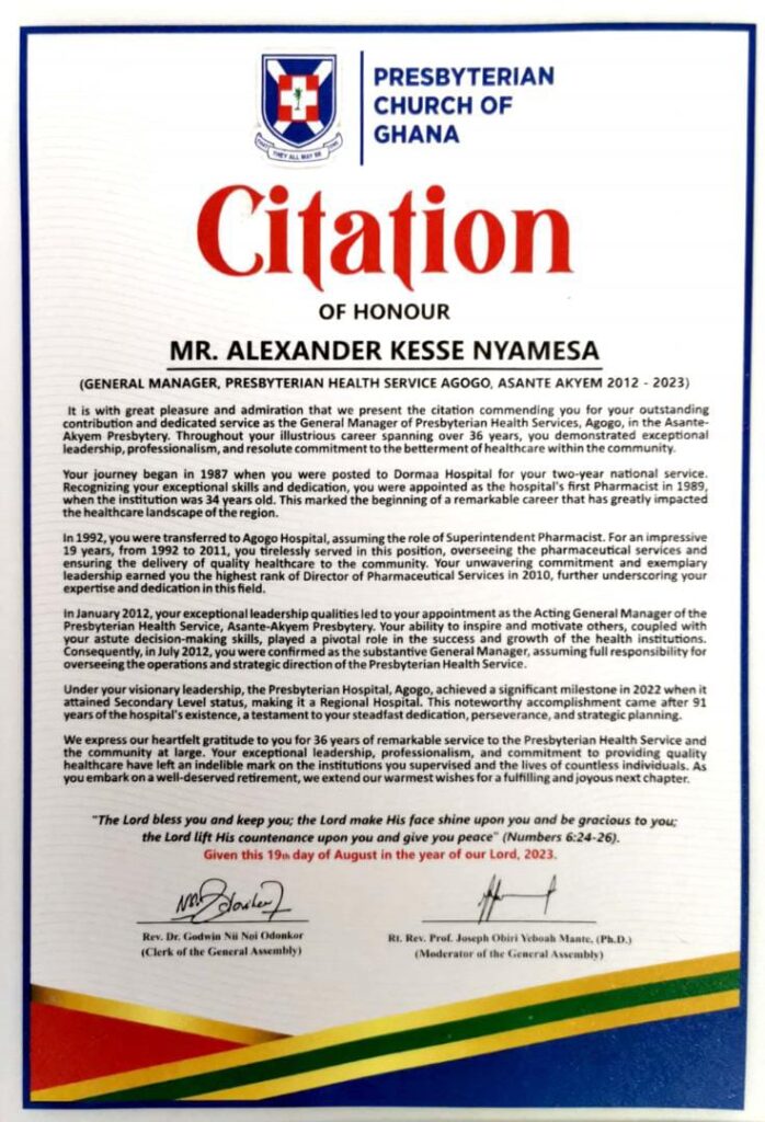 In a statement by the Presbyterian Church of Ghana on his retirement, Mr Alexander Kesse Nyamesa was highly decorated by the church for his selfless dedication.