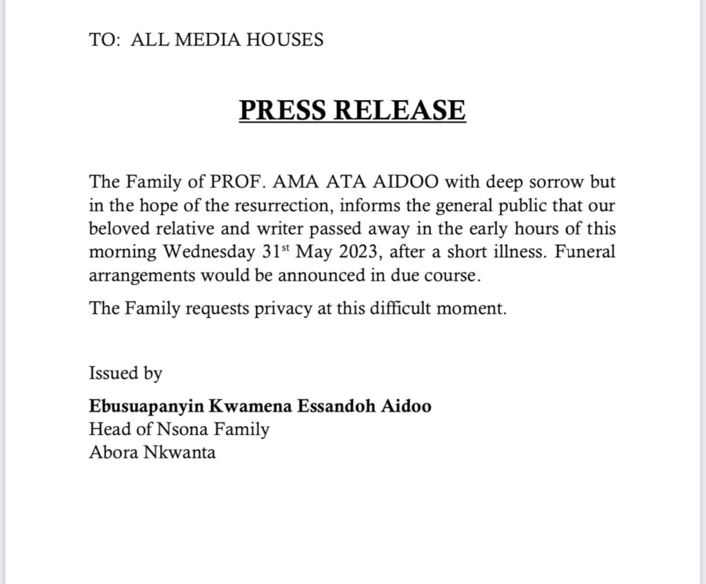 “The family of Prof. Ama Atta Aidoo, with deep sorrow but in the hope of the resurrection, informs the general public that our beloved relative and writer passed away in the early hours of this morning Wednesday 31st May 2023, after a short illness,” the statement partly read.