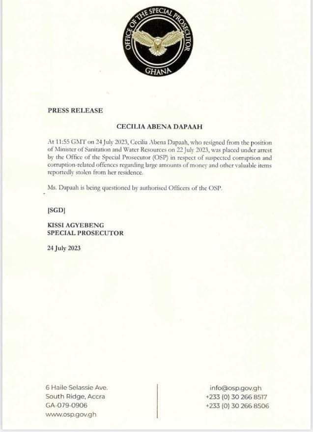 A press release headlined: `CECILIA ABENA DAPAAH’ dated Monday July 24, 2023 and signed by the Special Prosecutor, Kissi Agyebeng stated that the former minister, Cecilia Abena Dapaah was placed under arrest by his office “in respect of suspected corruption and corruption related offences regarding large amounts of money and other valuable items reportedly stolen from her residence”