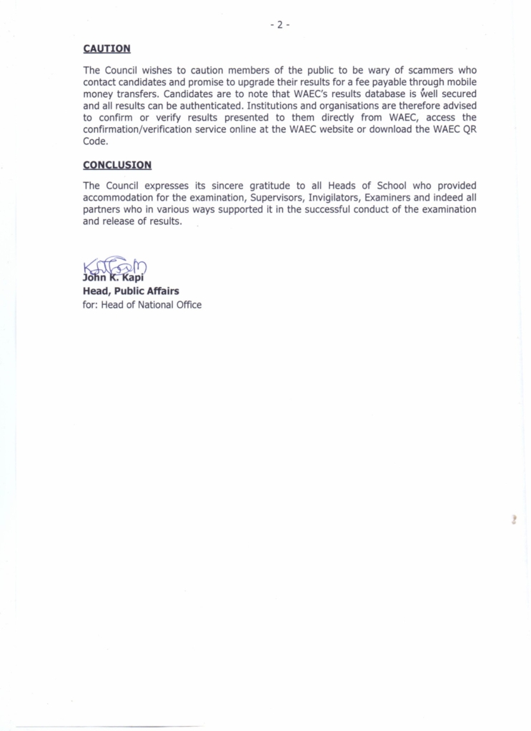 The statement further said that the withheld results of the candidates would be released or cancelled based on the outcome of investigations.
